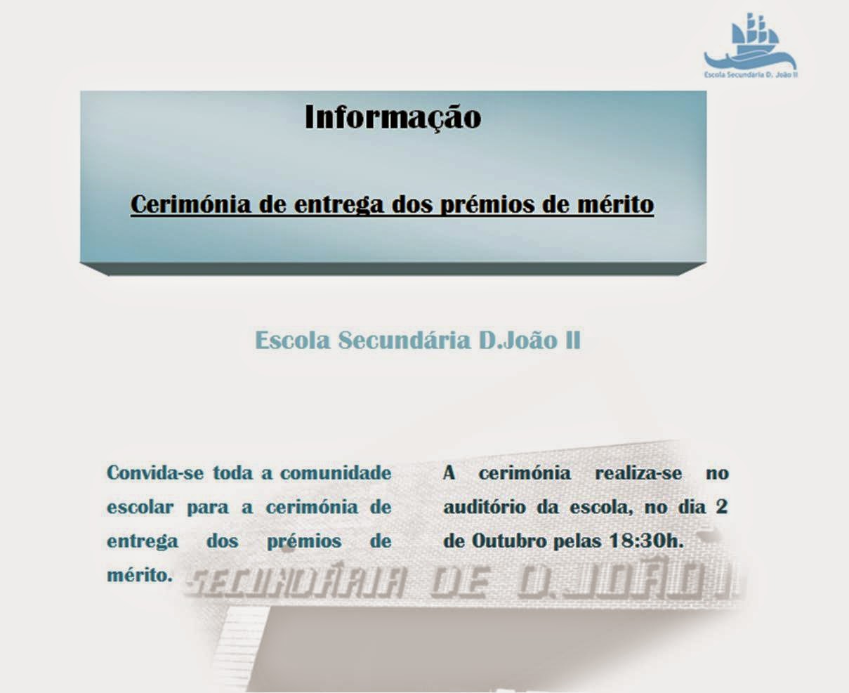 A Escola Secundária D. João II, em Setúbal, vem por este meio convidar Vªs Ex.ªs para a Cerimónia de Entrega de Prémios de Mérito, que se realiza dia 2 de outubro de 2014, pelas 18.30h, no auditório de escola.