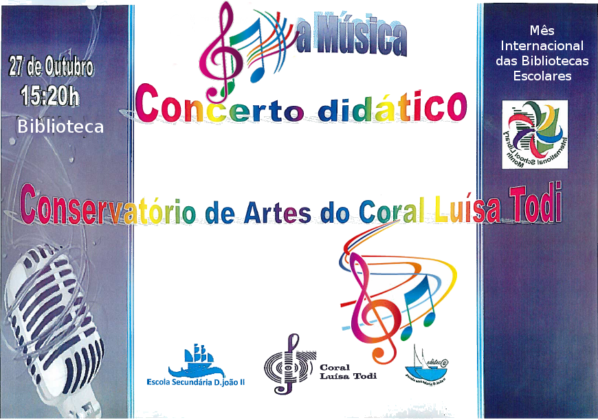 Para comemorar o Dia Internacional das Bibliotecas Escolares, dia 27 de setembro, teremos um concerto didático com professores do Conservatório de Artes do Coral Luísa Todi, pelas 15,20h, na Biblioteca com a participação das turmas do 7ºB, 8ºD, 10º L e 12ºI