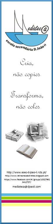 Nos dias 13 e 14 de Setembro iniciaram as aulas na Escola Secundária D. João II - Setúbal, como praxe foram recebido na Mediateca, onde a professora bibliotecária lhes explicou o que podiam fazer por ali.O lema desta recepção foi "Cria, não copies. Transforma,não coles!" é este o caminho que queremos para os nossos alunos, para não se esquecerem levaram no bolso um marcar ...