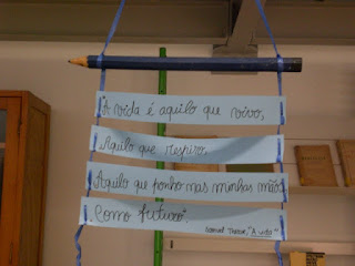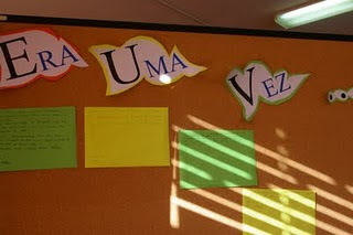 Realizámos também uma actividade de escrita a partir de um mural "ERA UMA VEZ", onde os alunos teriam de criar uma história através de cinco palavras, aleatórias, fornecidas pela Mediateca. Esta actividade foi muito interessante e denotou-se, por parte dos alunos, motivação, empenho e criatividade.4 e 6 de Abril